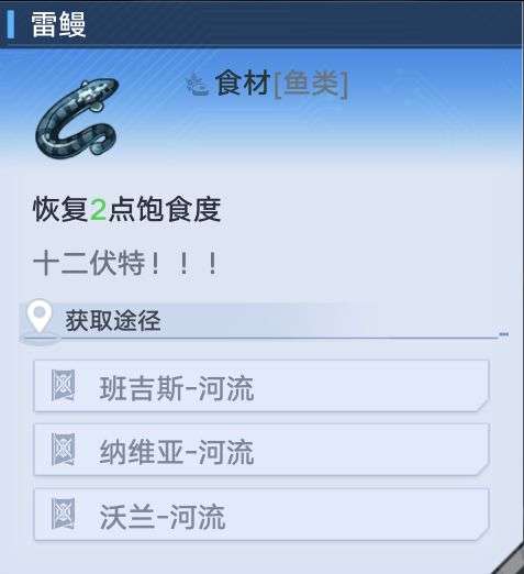 雷鳗:玩家在沃兰河流、班吉斯河流、纳维亚河流都能获取。