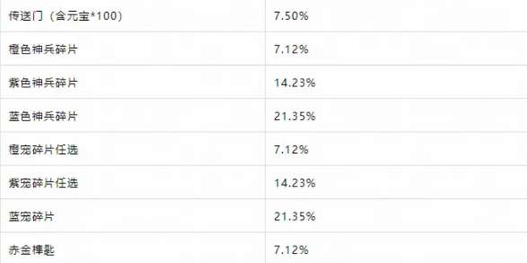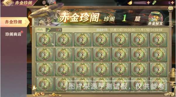 活动期间,小将军通过消耗「赤金榫匙」打开“赤金珍阁”即可获得灵宠碎片任选、赤金榫匙、神兵碎片等稀有奖励,小将军打开每层的传送门时即进入下一层赤金珍阁。