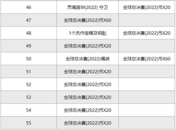 5、解锁通行证并将里程碑等级提升至47级时将总共可获得2000个全球总决赛(2022)币,首次将里程碑奖励提升至55级时将总共可获得2200个全球总决赛(2022)币。