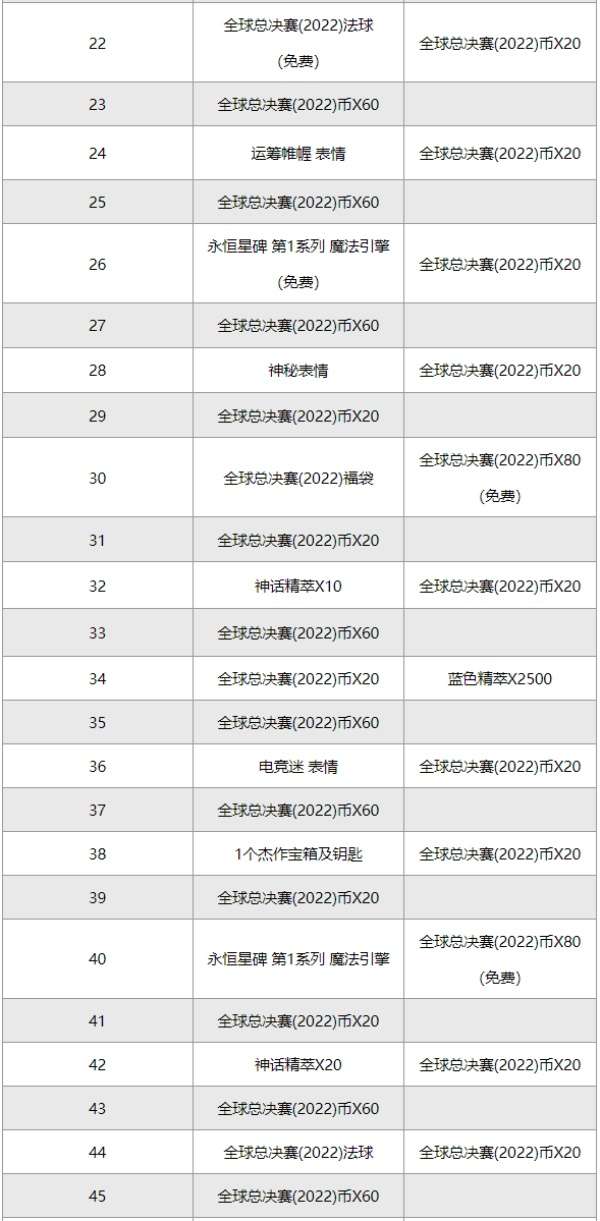 3、提升通行证里程碑可获得的免费奖励为:400个全球总决赛(2022)币、1个全球总决赛(2022)法球、全球总决赛(2022) 图标、表情 摇起来、1个永恒星碑 第1系列 魔法引擎与1250蓝色精萃。