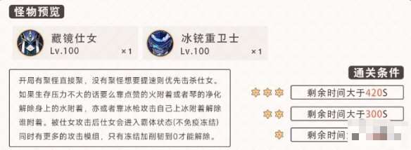仕女每15秒会释放水光环,CD翻倍,则血量极厚,如果练度不够想要提速只能优先击杀她。如果输出不够还优先考虑击杀冰枪基本与满星无缘,当然击杀冰枪生存压力最少,但也慢慢等CD转好磨死仕女。