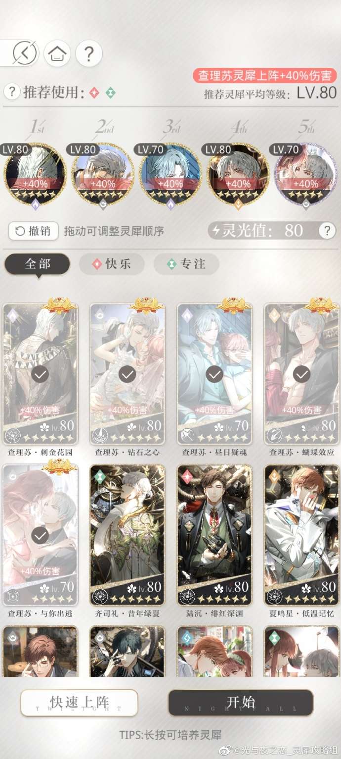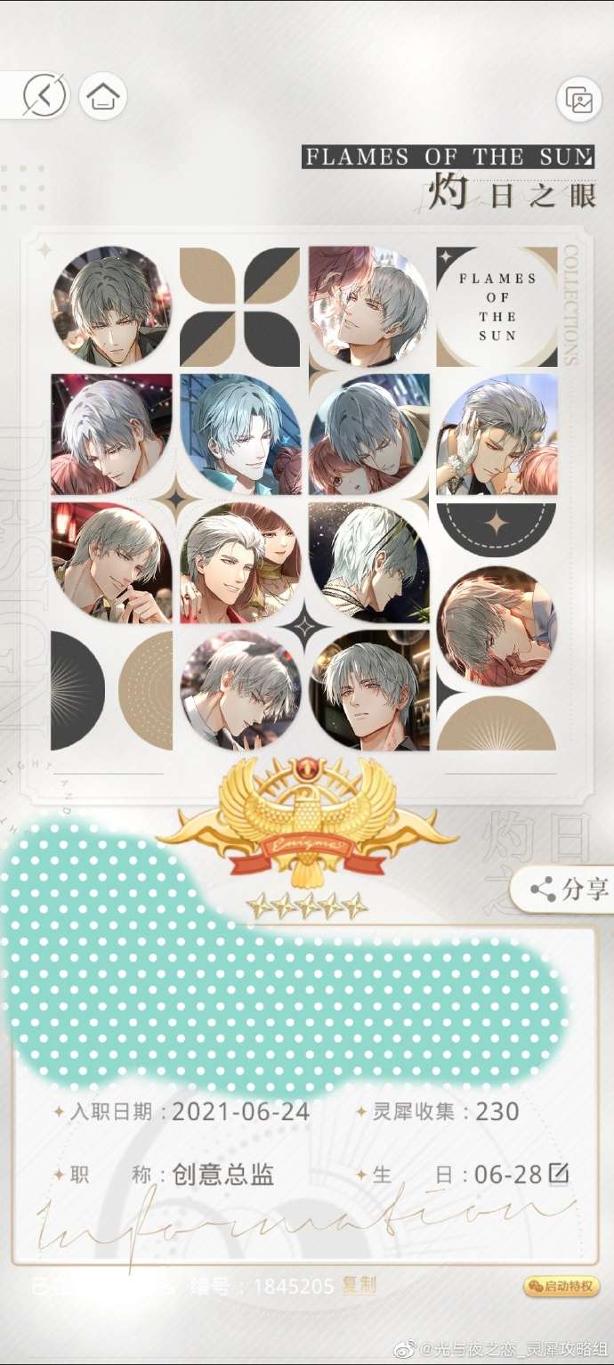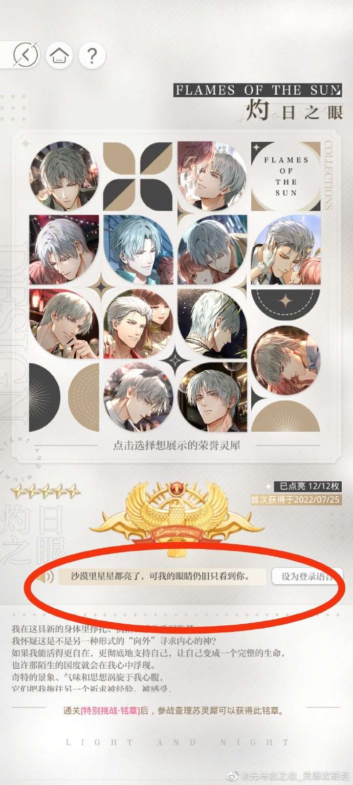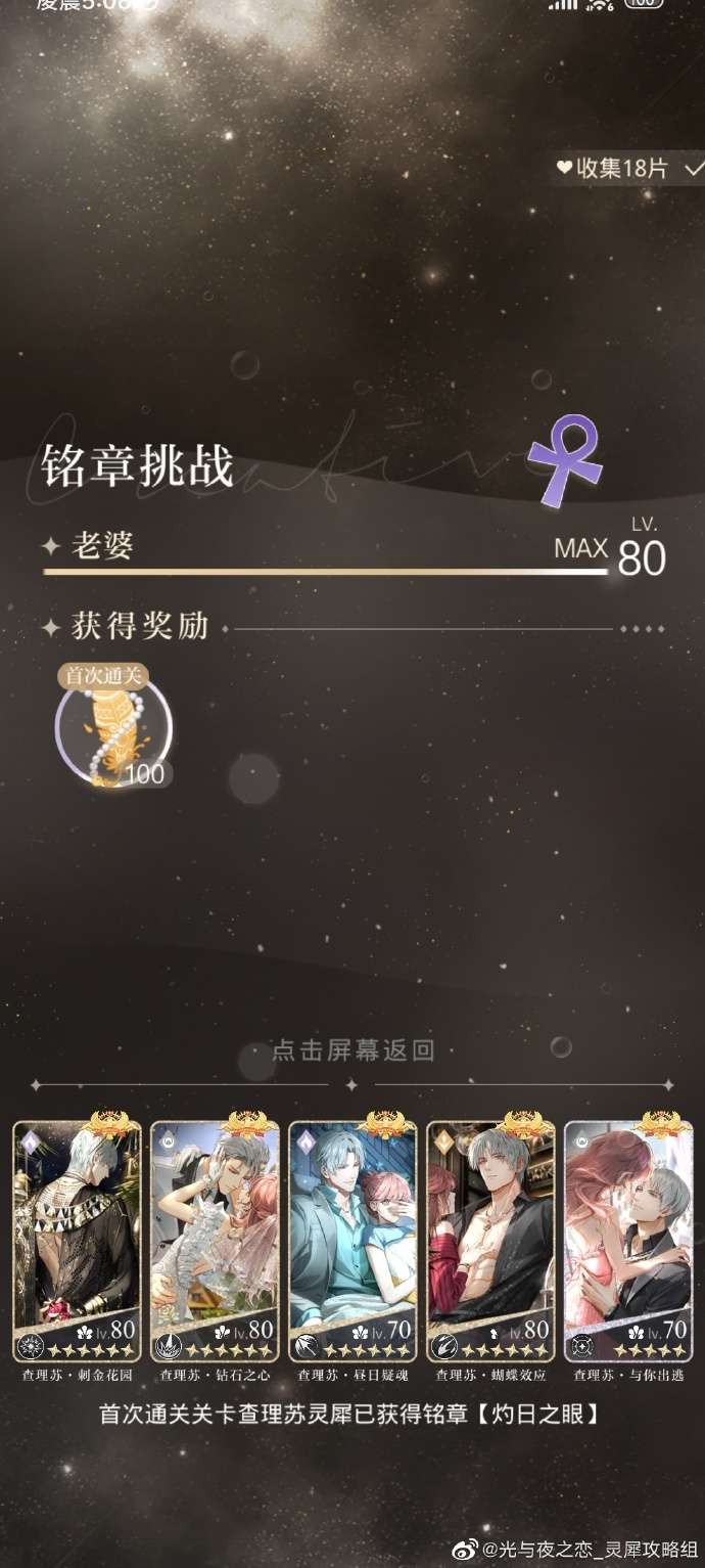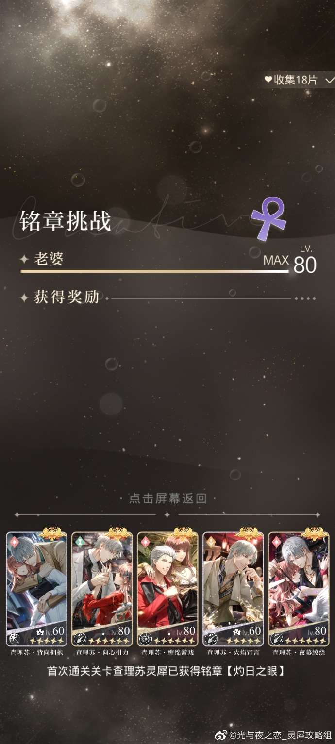 如果全部携带查理苏灵犀打不过,可以带1或4其他男主高战力灵犀+其他带查理苏灵犀,这样慢慢打,直到有12张查理苏灵犀全部获得【灼日之眼】。