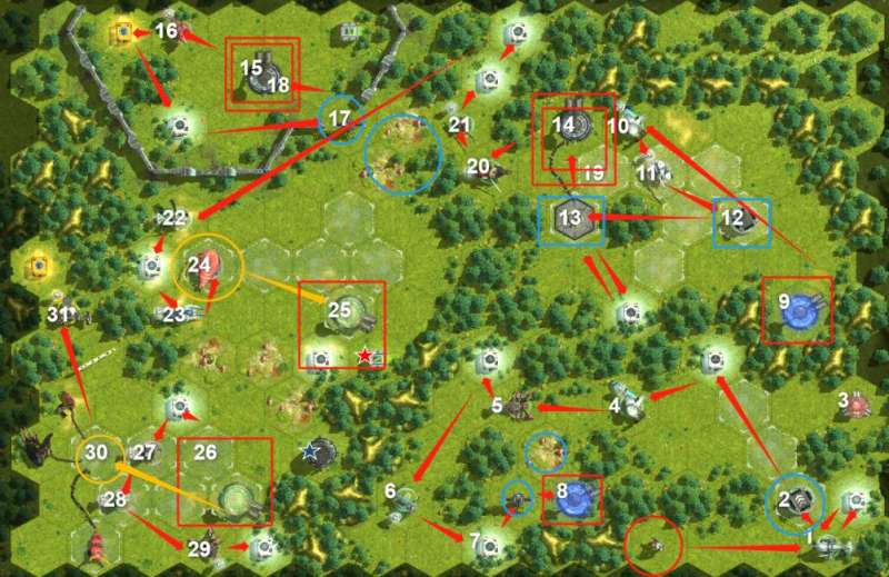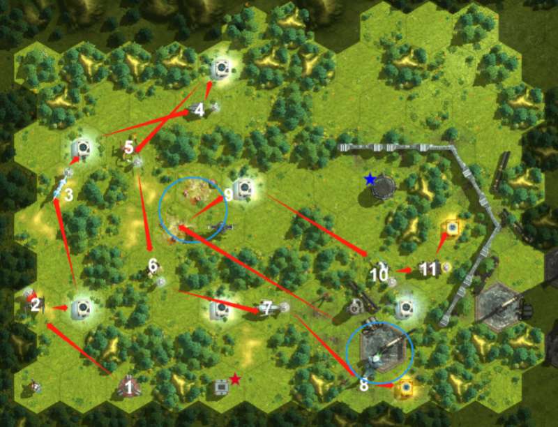 1、第一关非常简单,而且有很多教学引导,按引导和下图标注的1-11的路径直接走就能通关。