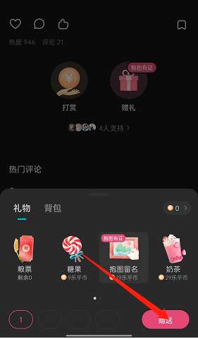 1、打开lofter,找到喜欢的作品后,进入评论区,点击如图两个位置的【赠礼】。