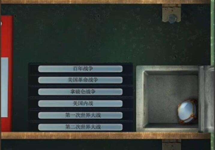 141、返回办公室,点击办公桌下面的柜子,根据三个展柜中武器的数量(枪4、斧2、刀剑5),打开柜门,获获得【旋钮1】和【火药】。