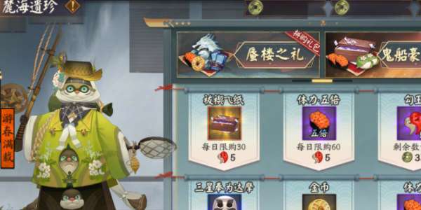 在活动中获得的「古旧铜币」,可在「麓海遗珍」商店兑换 镰鼬新皮肤「游春满载」、随机SSR/SP式神召唤券、御行达摩、神秘的符咒、活动限定插画、活动限定静态头像框「蜃影危途」、活动限定动态头像框「蜃影危途·战起」 等奖励。