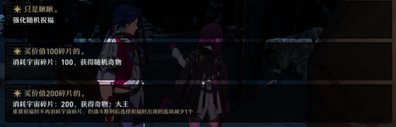 一般情况选100碎片,如果当期是繁育星神干涉,或队伍中有三月七或杰帕德,可以选记忆印章,如果是最终BOSS前一张怪物图,并且有奇物“月亮井”的话,可以选择哈哈镜。