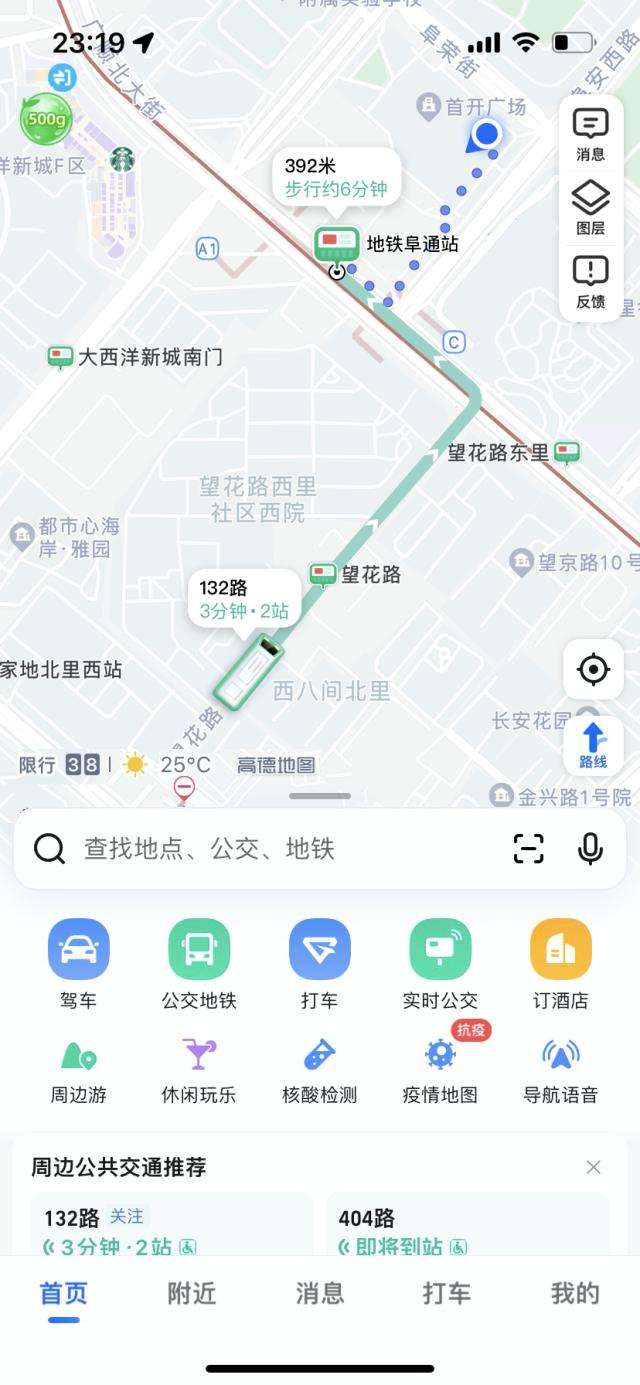 这样一来,即使用户到了陌生地点,也无需再在手机上搜索查找,从当前所在位置怎么坐公交或地铁到家,在APP首页就能看到,点击后还能展开具体换乘与步行方案,一目了然。