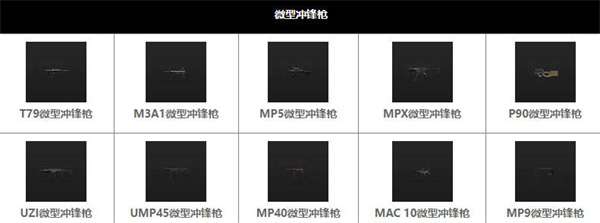 6:微型冲锋枪T79微型冲锋枪M3A1微型冲锋枪MP5微型冲锋枪MPX微型冲锋枪P90微型冲锋枪UZI微型冲锋枪UMP45微型冲锋枪MP40微型冲锋枪MAC10微型冲锋枪MP9微型冲锋枪