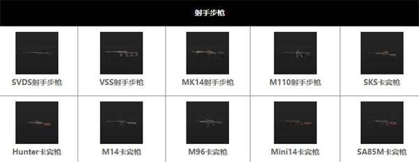 2:射手步枪SVDS射手步枪VSS射手步枪MK14射手步枪M110射手步枪SKS卡宾枪Hunter卡宾枪M14卡宾枪M96卡宾枪Mini14卡宾枪SA85M卡宾枪