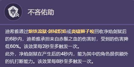 迪希雅通过熔铁流狱·剑域炽焰或炎啸狮子咬回收净焰剑狱后的6秒内,迪希雅承担来自赤鬃之血的伤害时,受到的伤害降低60%。该效果每2秒至多触发一次。