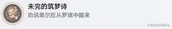 (12)进来后,去1位置对话完后,去2位置,在2位置对话最后如果选择【必须唤醒奥尔拉!】,则最后完成任务后,会获得成就《未完的筑梦诗》,如果选择【放任奥尔拉离开】,则会获得成就《不如归去》,属于【与你同行的回忆】