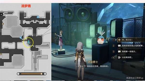 (1)需要先完成前置主线任务后,才能来到【流梦礁】下图位置找【湛蓝爵士】对话,选择第1个选项【关于米哈伊尔...】后,接到该任务,接着和旁边出现的钟表小子对话一下