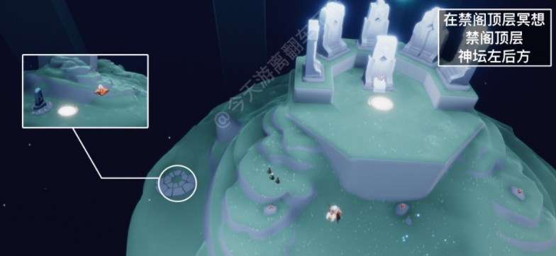 首先我们需要先进入禁阁地图,抵达禁阁顶层以后朝着终点神坛左侧的方向飞过去,即可在左侧山脚就是台阶左侧下方看到冥想点的位置了。只需要坐在光圈冥想点中进行打坐冥想即可完成任务。