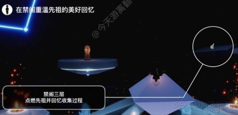 会发现浮台上有位先祖,先祖是有蓝色光芒的,还是很容易会被发现,飞到先祖身旁。点亮先祖根据蓝色光芒的指引追随回忆即可。