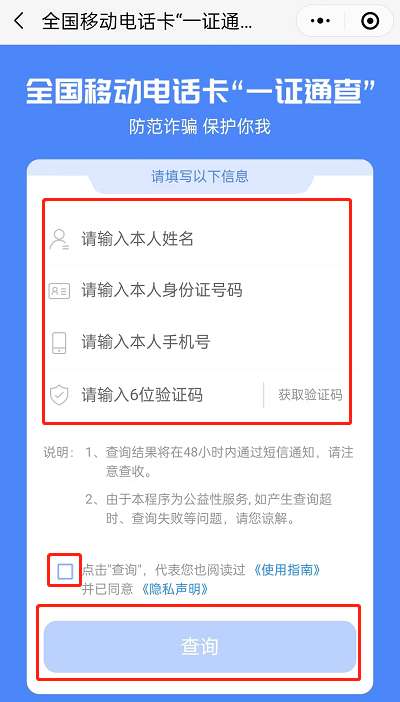 3、输入必填信息,勾选已阅读协议,点击查询。