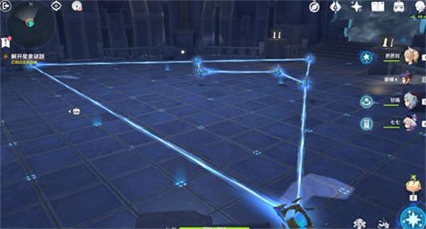 2、然后就是第二个门,上和下的图案,进入之后可以看到这个缝隙,把地上的装置进行连线,答案如图所示,接着就会进入一个特殊的场地,跟着星星走,然后可以看天上的迷宫;