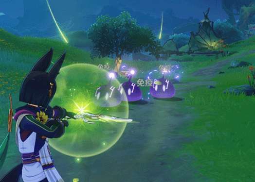 从这里就可以看出,提纳里的输出相当稳定。不过追踪箭是有时效的,敌怪要是闪现或者距离过远,追踪箭是会消失的。E技能,提纳里向前投掷种心雷,种心雷命中敌人时会产三到四颗球。之后产生一个嘲讽领域,嘲讽一定范围内的敌人,吸引它们的火力。这个领域会持续八秒,并不像召唤物生命值会被打爆。