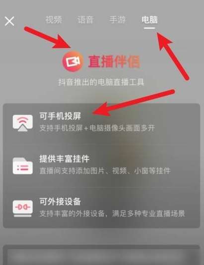 接着在开直播界面里,选择电脑,这样就可以打开直播伴侣,通过手机投屏就可以同步了。