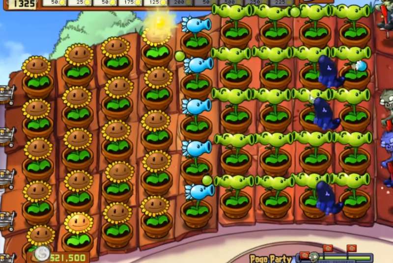 当我们的阳光攒到350时,我们就可以在第五排先种下一个寒冰射手,对僵尸进行减速,这里需要注意的是,豌豆类植物一定只能种在前五排,因为屋顶关的特性,后四排是一个斜坡,豌豆类植物是打不到前排僵尸的。然后我们再在寒冰射手的前排种下一个双向射手,因为蹦蹦僵尸会直接跳过你的植物,所以双发射手打后排的强力火力就提现出来了,寒冰射手给僵尸上减速buff,双向射手再进行高火力输出,可以轻松消灭僵尸。