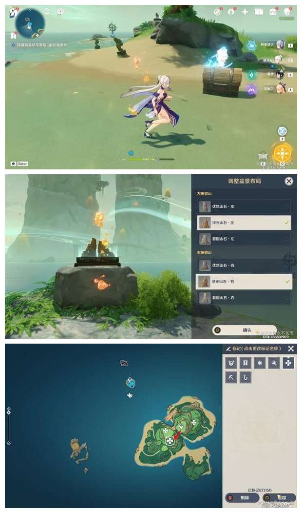 第二步,这里有三个仙灵台,我们先更改盆景布局,左右两侧都选择【优悠山石】