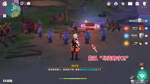 3、这里由于雕像们站的很近,直接过去选无法分辨出哪个选项对应哪个角色,很容易选错,建议来我下图的位置,贴着墙一点点挪到只能选到“盗宝团「哌」”的位置再进行指认。