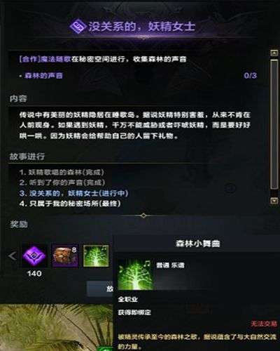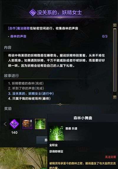 5、玩家途径托托克港口需要修理一下船舶再前往睡歌岛,在睡歌岛上与隐形的妖精对话接受并完成任务,需要完成3次最后获得任务没关系的,妖精女士,任务需求完成3次岛上隐藏合作任务歌声伴随魔法,该合作任务需要使用共鸣之歌在完成岛上限时合作任务秘密空间后开启。