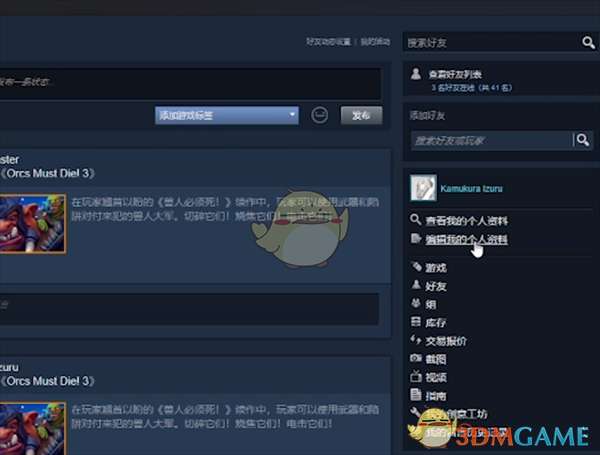 1、点击steam上方的个人昵称选项可进入个人页面,在个人页面中点击右侧的【编辑我的个人资料】进入设置页面。