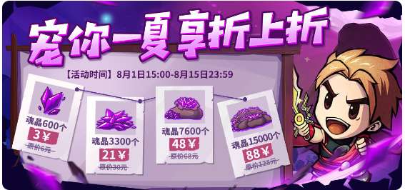 -暑期超值折扣魂晶+15000个:原价128元,活动期间首次购买折扣价88元