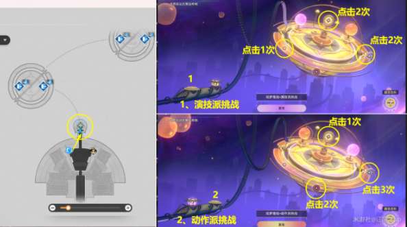 3、接着在下图对应位置点击,将右下【盛会百科】图标下的3个点都点亮后(【盛会百科】图标会消失),即可发车去完成对应挑战了,次数点错了也没关系,只要能让右下【盛会百科】图标下的3个点都亮了就行;