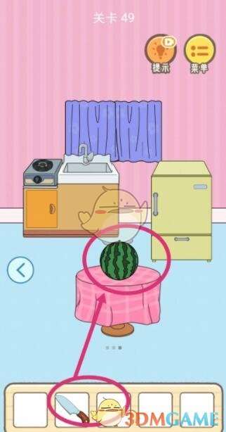 最后,把【西瓜】放到桌上,用水果刀切开,游戏过关。