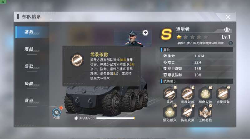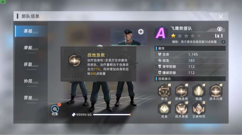——配队思路追猎者和飞鹰救援队是整套阵容的两只核心部队,追猎者担当着能量回复和减益地方的作用,技能【武装破除】能够减少地方部队攻击和防御,还可叠加;而飞鹰救援队则可凭借着超强的闪避属性充当一定前排任务,技能【战地急救】还能为我方单体队伍进行回血,“公约范跑跑”实至名归。