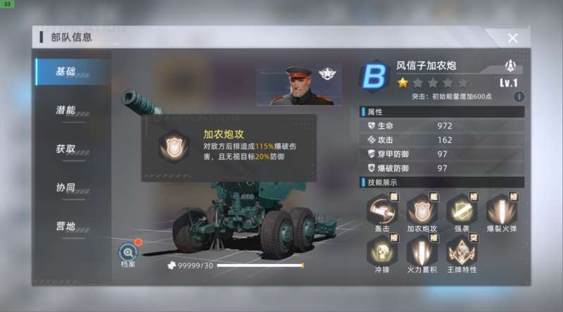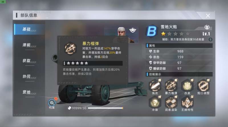 而整个队伍的输出还得靠雪地火炮和风信子加农炮这两支队伍,雪地火炮的【暴力榴弹】能对敌方一列造成穿甲和暴击的AOE伤害,风信子的【加农炮攻】则是对地方后排造成无视防御的AOE伤害。