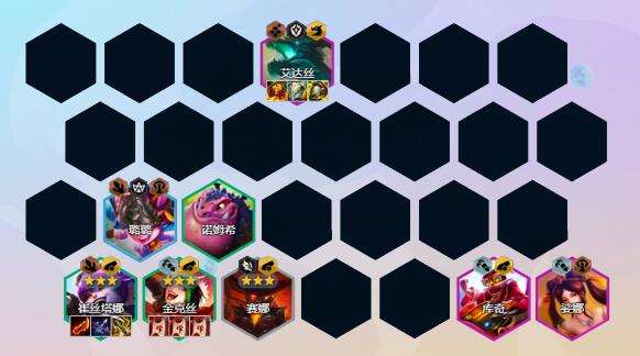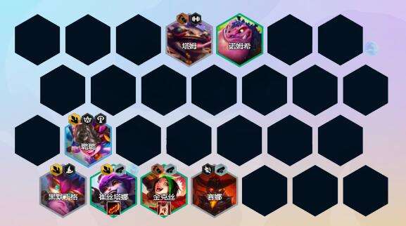 2阶段:2-1不拉人口3人口,2-3跳4人口,前期崔丝塔娜、赛娜、黑默丁格2驯龙2炮手过度,站位如上图,确保连败,更快的养成诺姆西后期也是一个强有力的前排,4人口有璐璐上璐璐没有就上金克丝,前期不做装备,做了连败就没了,选秀抢大剑、反曲之弓、腰带等装备,2阶段吃满5连败即可。