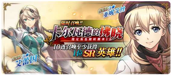 限时召唤「卡尔瓦德的拂晓」中SSR级英雄艾蕾因、亚妮艾丝出现概率提升!
