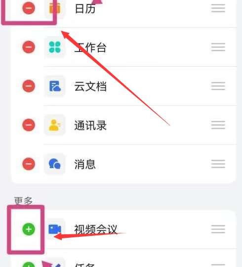 3、最后通过加减符号来修改底部的导航键的顺序,修改完成后点击确定,返回重新打开飞书即可看到新的顺序。