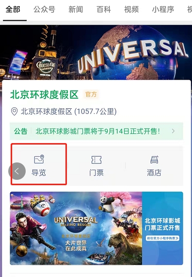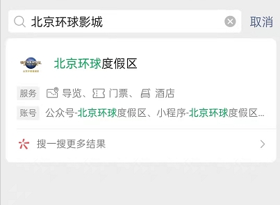 1、打开微信,搜索北京环球,点击进入北京环球度假区。