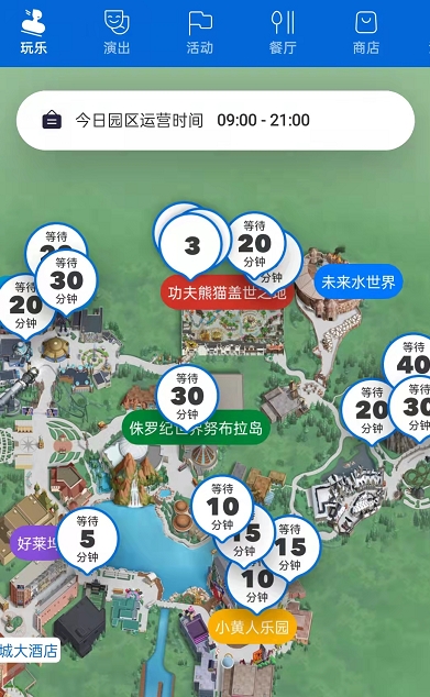 3、导览页面就可以查看每个景区大概需要等待多久了。