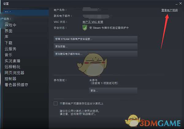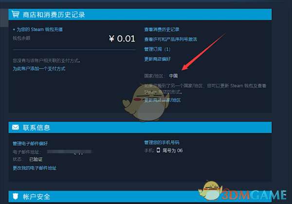 2、在设置页面中选择账户并点击账户明细进入steam账号的个人信息页面,在个人信息页面中间的位置可以查看用户自己的所在地区设置,点击变更即可开始变更自己的地区设置。Steam因为在不同的地区有不同的商品定价,所以玩家也可以在商店中通过发售游戏的货币币种来判断steam所在区域。