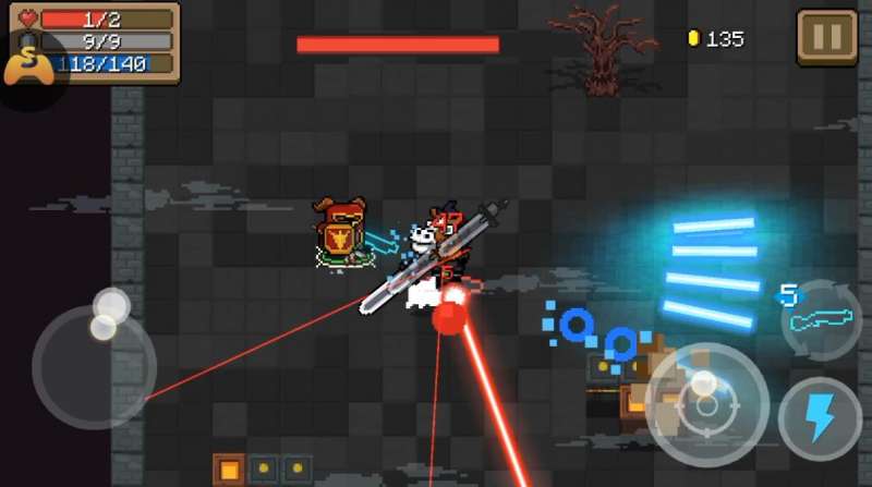 在刚刚进入boss房间的时候,无头骑士和它的马还是一个整体,他一共有着三种主要的攻击方式,首先是挥舞手中的剑发射弹幕,弹幕的类型有两种。首先是360度的圆形弹幕冲击,会覆盖大部分的空地,但是飞行速度较慢,只要离得比较远,基本上都能安全的躲掉伤害。然后就是朝着指定方向发射三角形状的飞弹,这个速度就比较快了,一定要提前躲避,或者借助近战武器清除弹幕,这两种弹幕在命中玩家之后都会造成4点伤害。最后是使用剑瞄准指定方向,并持续性的发射激光攻击对手,从而造成一定的伤害。激光所能打到的范围是一个锥形,只要我们移动,还是不容易命中的。