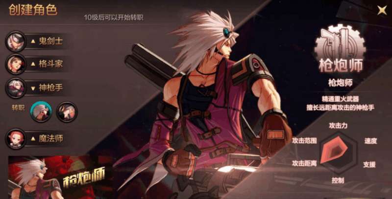 神枪手:转职:枪炮师、漫游枪手,在手游中一共有两个转职可以选择,因此绝大部分玩家会选择枪炮师,因为这个职业虽然PVP不强,但PVE却出奇的厉害,对比起漫游枪手血脆依赖装备的特点,这个转职性价比更高。