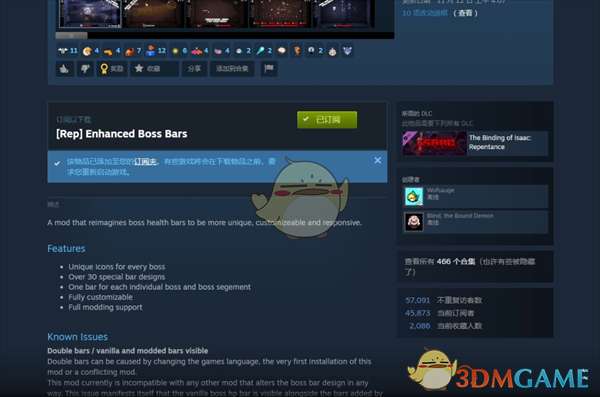 2、在创意工坊中点击自己需要下载的mod,在mod中点击订阅便可下载相对应的mod文件,不过对于大部分游戏来说,mod文件还需要在具体的游戏内容开启。