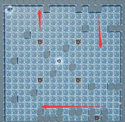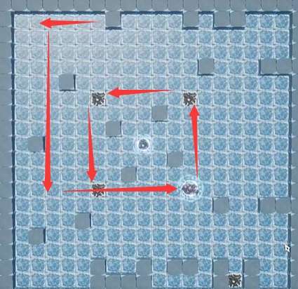 3、接着需要往下走,接着要在箭头转向位置停下,然后把这里的四个黑格子按照指引踩一遍。