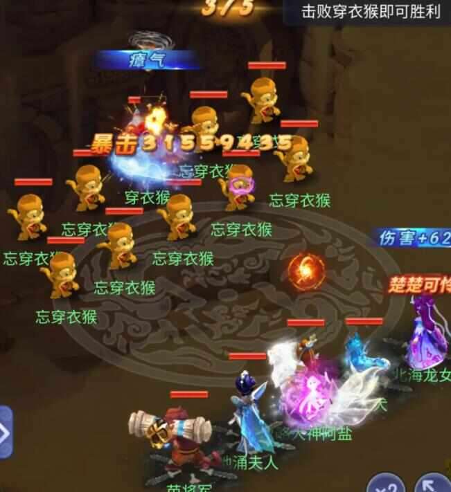 穿衣猴的气血较低,所以我方可以用打最低气血的伙伴,以及人物用大唐技能来集火穿衣猴。