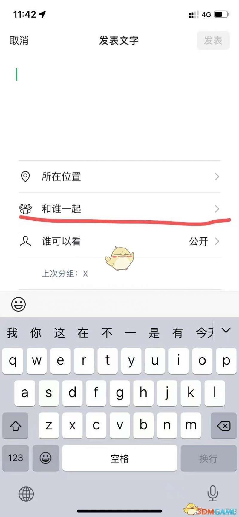 2、在内测版微信中,当用户在编写朋友圈时,在下方的“所在位置”和“谁可以看”之间新增加了一个“和谁一起”的选项。在该选项中,你可以选择你的微信好友,被选中的好友在你发送完该朋友圈后,其同样也会收到提醒。
