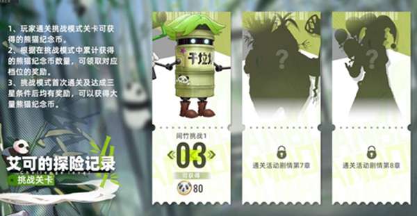 2、挑战模式根据玩家剧情模式的进度解锁,消耗情绪可进行重复挑战;挑战模式可获得熊猫纪念币,用于在活动商店中兑换道具奖励。