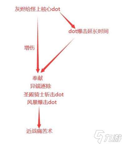 目前疑似是dot的一共有奉献、异端逐除、晨光(DawnLight)、日灼(太阳神使小点,风暴/愤怒之锤版异端逐除)、曜日化身(太阳神使大点,类似邪DK食尸鬼连线)、圣殿骑士斩击。但因为dot增伤好像没实装所以没法测试