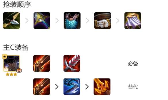 装备优先反曲弓这个阵容非常吃火炮,其次饮血备选物理输出。