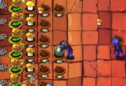 2、先种植一列向日葵花盆和一列阳光向日葵,在右侧补充一列阳光菇投手。