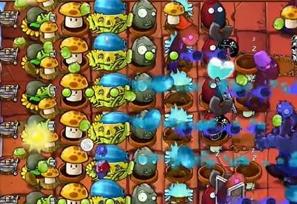 3、在阳光菇投手右侧种植一列冰冻西瓜大喷菇,在外侧种植三个僵尸坚果墙。